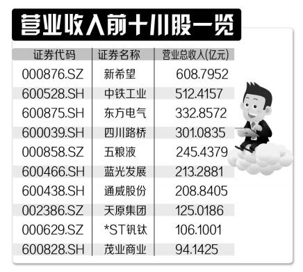此外,东方电气和四川路桥2016的营业收入分别达到332.86亿元和301.08亿元。五粮液、蓝光发展、通威股份、天原集团和*ST钒钛5家公司2016年的营业收入也超过百亿元。