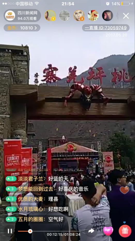 活动现场,四川新闻网开启“樱”乐节直播盛况,据统计,1个小时的直播,共吸引了94万余人次观看,网友纷纷点赞,留言“理县的甜樱桃好想吃”、“理县的民族服装太好看了”、“好想来理县摘樱桃啊”、“当地民族的音乐好好听”等,还有网友表示有机会一定要来看看理县古老的羌寨。
