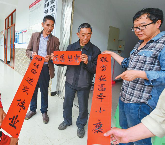 叙永县正东镇普市村四社的脱贫群众书写对联,喜迎省第十一次党代会的召开。