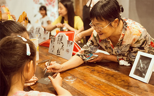 中国工艺美术大师、四川省非物质文化遗产蜀绣代表性传承人孟德芝、漆器国家级传承人尹利萍、银花丝省级传承人倪成玉、糖画省级传承人谢丰坤四位大师联袂来到了活动现场,与30位小朋友进行了近距离互动。孩子们通过聆听大师讲解、亲手参与四种手工技艺的制作,对非遗有了更感性更深刻的感受。
