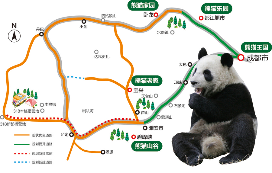 目前的线路图上,如果从成都大熊猫繁育研究基地出发,走北线可沿途经过都江堰熊猫谷、卧龙、小金、丹巴等,也可以走南线,途经雅安碧峰峡、宝兴、天全、泸定等。南北两条线相交即可形成一条大环线,可满足长、短线游客的不同需求。