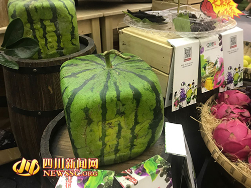 大邑展区同样人气爆棚。该展区采用生态竹剥皮原色和水墨手绘设计,清新雅致。在这里,两个呆萌可爱的方形西瓜成了“馆红”。据介绍,方西瓜最先是日本种出来的,方法是在西瓜上套上一个方箱,随着西瓜不断长大套用不同规格的方箱,最终将西瓜的形状塑造成方形。此外,蓝莓冰棒,蓝莓牛轧糖,蓝莓果酱、安仁葡萄、安仁蓝莓、唐场豆腐乳、出江青梅酒、大邑金蜜李、王泗白酒、大邑榨菜地标产品也齐齐亮相。