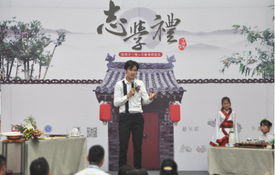 在潺潺古琴声中,身穿汉服的少年陆续走上舞台,展示古代学子之风采,在主持人的引导下,净手、由尊者为其点朱开慧、书文达志、跪拜感恩父母、奉茶行礼……活动现场座无虚席,成都双流万达负责人孙洪,国际青少年商业创新促进会成员、IYBI公益活动ALLE执行长陈泽南,成都作协作家李桅及都会美家居家生活连锁创始人郭俊伽等嘉宾出席了本次活动并致辞。