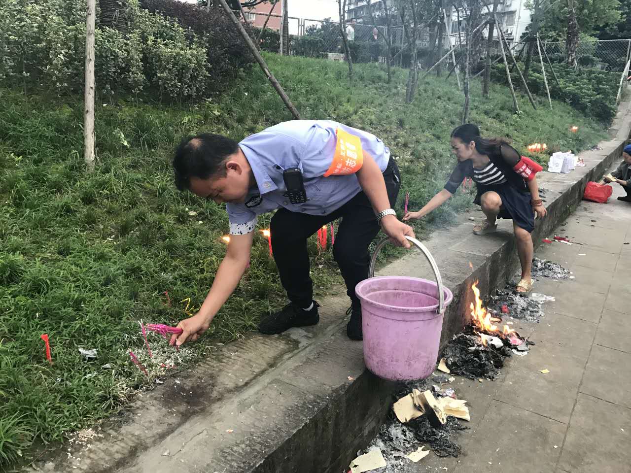 城管工作人员清除焚烧产生的灰渣及残留垃圾(图由成都市城管委提供) 3日晚7点多,玉林一巷有火星和烟雾,一处角落里还有一堆尚未烧尽的冥纸冥币,微风一吹,带着火星的冥纸冥币四处分散。玉林街道城管队员巡逻至此,连忙用水将火熄灭,环卫工人古阿姨将火堆扫进撮箕。接近巷尾,蹿起半米高的火苗引起了城管队员的注意,一对夫妇正在“添火”,香蜡烧得正旺。“大哥大姐,我们还是把火灭了哈。”城管队员走过去跟他们讲起道理:“你们思念逝者的心情,我们可以理解,但是我们最好换成环保的方式。” “好的,好的。虽然这是我们一直采取的祭祀方式,但以后我们不烧了,老爷子生前喜欢喝酒,我们就敬他一杯酒,聊表思念之情。”两夫妇连忙表示,以后会换环保的方式来表达思念之情,“你们说的对,这是我们大家生活的城市,应该共同爱护。” 此外,四川新闻网记者今日还从成都市城管委了解到,为弘扬绿色节俭、关爱环境、杜绝污染的文明风尚,消除公共安全隐患,市城管委从4日开始,连续三天向成都广大市民发送环保祭祀手机短信,短信内容倡导大家以环保安全的祭祀代替焚烧冥纸,以静思怀想之情缅怀古人,用净清祭奠之举表意释诚。 据了解,截至目前,昨日、今日两天已向市民发送8000多条环保祭祀短信,预计三天一共向市民发送12000条短信。 |