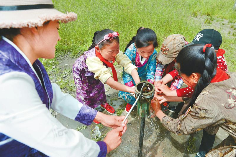 “手指并拢相互揉搓,双手交换……”在石渠县德荣玛乡中心小学校洗手池边,老师正在教小学生“七步洗手法”。