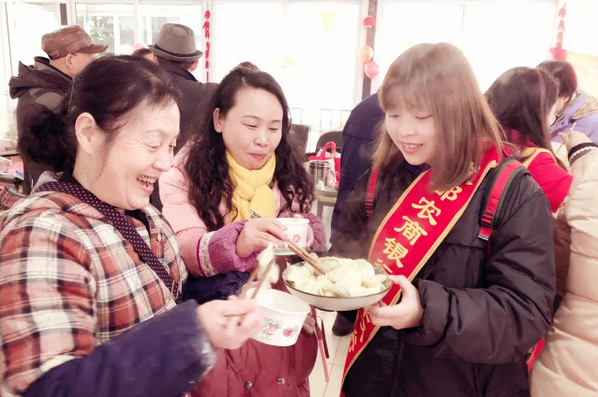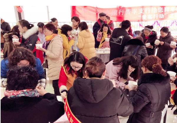 大家吃着热呼呼的饺子,脸上洋溢出了幸福的笑容。图为青羊支行同事为居民送上热乎乎的饺子。