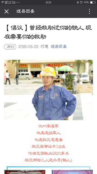 3月23日,理县团委了解情况后,在官方公众号上发出倡议,“李海军在2008年帮助过理县,是理县的恩人,我们一定会尽最大努力帮助他。”理县团委副书记王文丽说。
