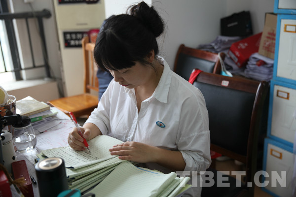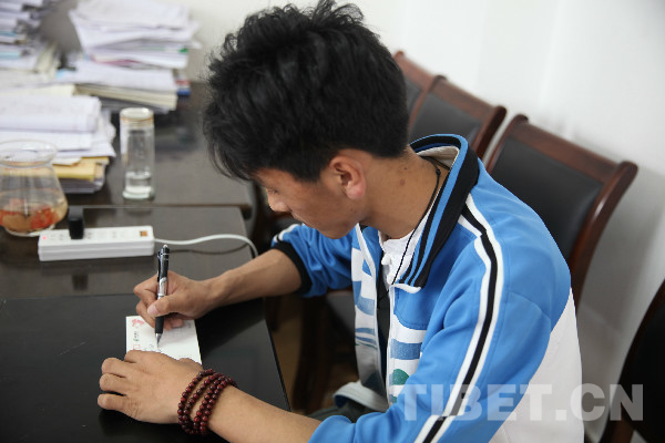 图:玉树学生班的更秋扎西正在给援建者写明信片