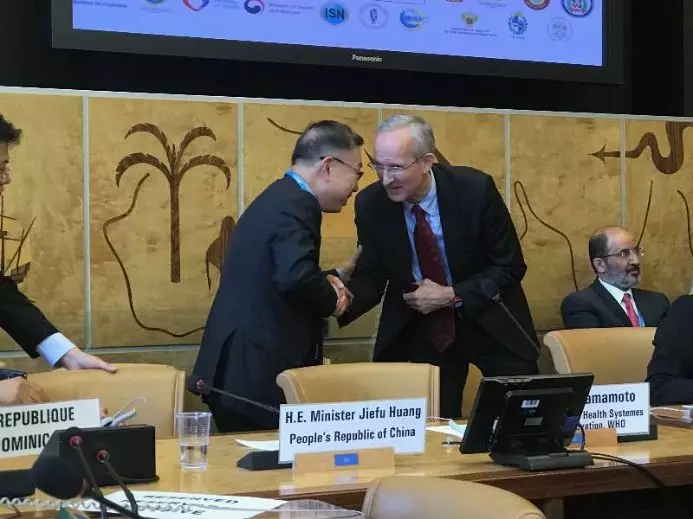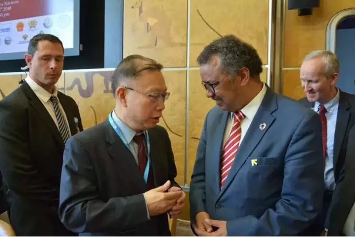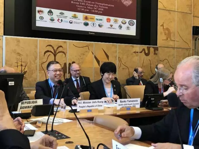 5月24日,日内瓦万国宫,世卫组织总干事谭德塞(Tedros Adhanom Ghebreyesus)在第71届世界卫生大会(WHA)“器官移植服务的全民覆盖”边会致辞后,走到中国人体器官捐献与移植委员会主任委员黄洁夫面前,用中文这样说。
