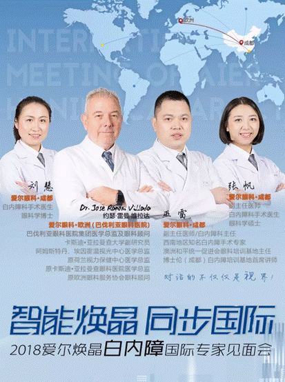 9月16日上午9:30,在成都千禧大酒店,2018年爱尔焕晶白内障国际专家见面会即将开展,活动中除了有很多优惠活动外,还有现场直播国内知名白内障手术专家巫雷主任为患者手术的全过程,将神秘的手术室公开透明的展示在您眼前。同时来自欧洲爱尔的Dr. Jose Ramon Villada将携手国内眼科专家共同解读白内障的相关防治知识。手术患者还将亲临现场,与您分享真实的患者案例,与手术体验。教你正确认识白内障,早日恢复清晰视力。