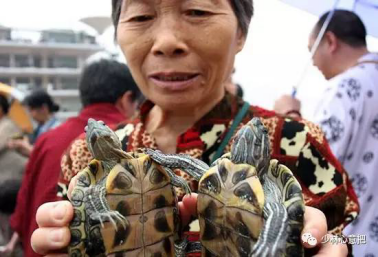 一名妇女正准备放生两只巴西龟