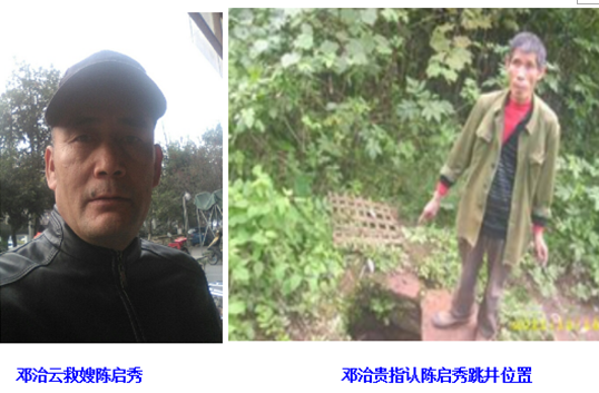 邓治贵回到家以后,他妻子陈启秀苦口婆心说:“以后不要习练‘法轮功’了,再也不要外出东游西荡了,饱一餐饿一顿的,胃病患了,身体消瘦不堪”劝邓治贵去玉丰医院看病。可是邓治贵大发雷霆地说:“我不去医院看病,要按师父说的练功治病,要去掉名利情,家里事我不管!”他妻子见老伴很固执,不愿放弃练功,非常生气,于是夫妻两人就争吵起来,邓治贵把妻子阻拦练功视为魔,对妻子拳打脚踢!陈启秀受了委屈,想不通就往附近水井里跳下去,寻求一死!邓治贵十分冷漠地说:“跳井我也不管,死了就没人阻挡我练功了!”幸亏当时邓治贵的弟弟邓治云在家,立即将陈启秀从井里救上岸,否则后果不堪设想。