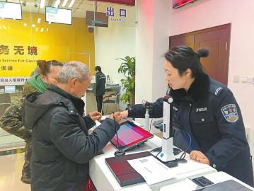 1月14日,江油市公安局出入境窗口工作人员指导办证申请人使用自助受理设备。 黄林森 摄
