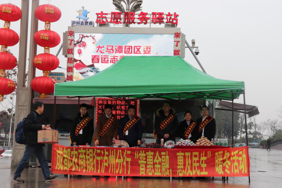 春节期间大量外出务工人员陆续返乡,泸州市最大交通枢纽中心泸州市汽车客运站迎来旅客高峰期。泸州分行组织志愿者贴心的地将一瓶水、一片药、一个点心送到千千万万的返乡务工人员手中,分行志愿者们希望他们的言行化作缕缕春风、融融春意,让务工人员过年回家的路伴着阵阵暖意。