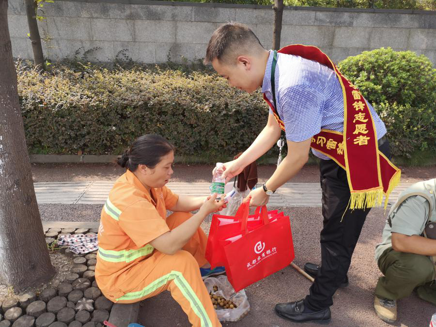 夏季泸州高温酷暑难耐,泸州分行组织志愿者开展“关爱环卫工人”志愿服务活动,免费为她们送上爱心水、防暑降温药品,送去一声问候,一份体谅和认同,感谢她们为城市、为市民的人居环境作出的努力和付出。