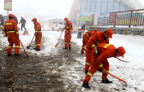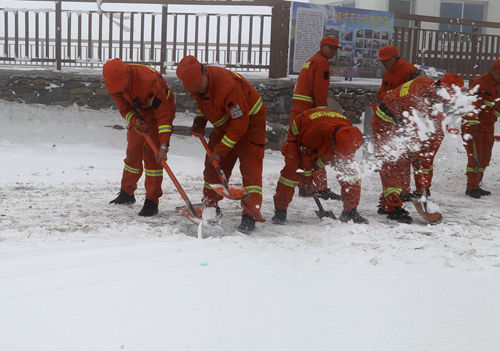 森林消防员们清理积雪。