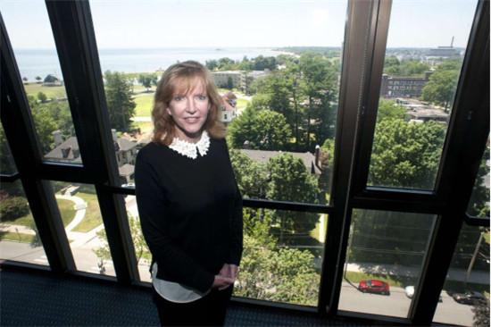 2018年7月9日,新任桥港大学校长劳拉·特朗布莉(Laura Trombley)在其办公室内(图片来源:Ned Gerard / Hearst Connecticut Media)