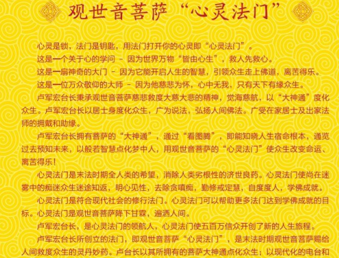 经了解,“心灵法门”,又名“卢台长心灵法门”、“观世音菩萨心灵法门”,是由澳籍华人卢军宏于2000年前后创立。卢军宏,自称“卢台长”,男,1960年生于上海,曾在上海长宁沪剧团、静安越剧团的工作过,1989年出国到澳大利亚并加入澳籍。2007年6月,卢军宏在澳创办了东方华语广播电台,自任董事长兼台长。?卢军宏利用他的电台,开办《玄艺问答》、《直话直说》、《白话佛法》、《玄艺综述》等栏目传播“心灵法门”。