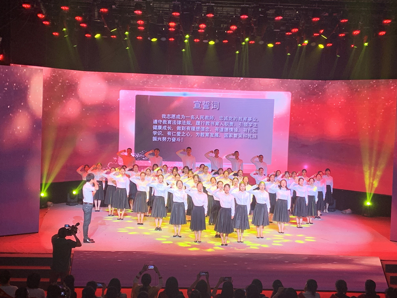 “落红不是无情物,化作春泥更护花”。活动中藏族舞蹈《青稞熟了》,展现了青羊教师在教育扶贫、教育扶智的路上感人动人的故事,长期以来青羊教育坚持精准援藏、精准援彝,以大格局大教育助推精准扶贫,把青羊优质教育资源输送支援到到偏远地区、贫困地区,带动民族地区提升教育现代化水平。“青出于蓝而胜于蓝”,活动中来自教育部直属师范院校51名优秀大学毕业生新教师现场进行了庄重宣誓仪式,宣示传承教育薪火、勇担教育责任使命的决心信心。杰出校长代表带来的《慧治善教——青羊教育颂》,表达了校长们师心不变、师魂永存的初心追求,表达将以高水平治校理教引领教育高位优质领先发展,不断为“一干多支”“圈层共建”贡献力量。活动在集体大合唱《我和我的祖国》中圆满落下帷幕。
