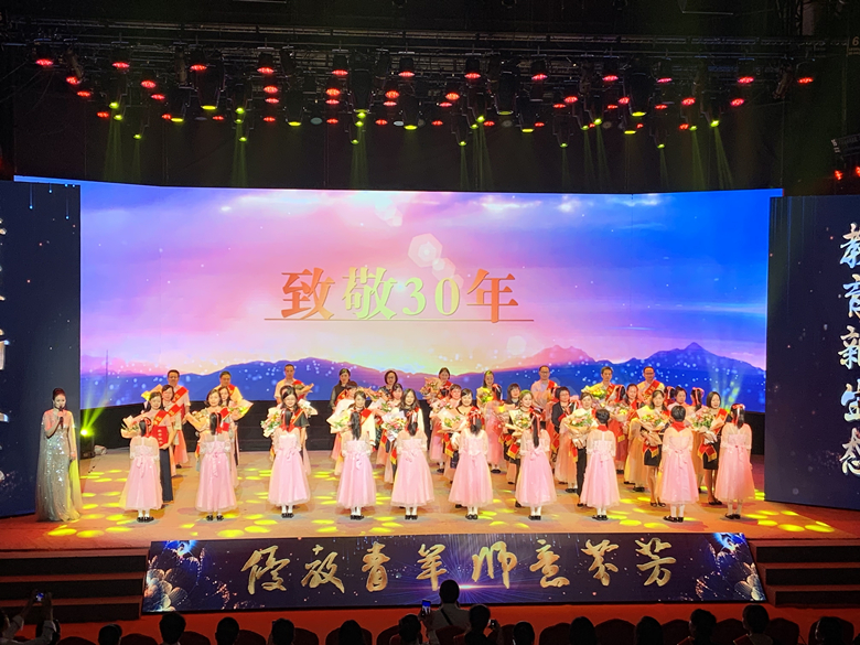 “令公桃李满天下,何用堂前更种花”。活动在童声合唱《众里寻你》中拉开帷幕,30名教师代表带来的情景表演唱《我的青春在路上》,艺术展现了青羊教师为教育事业的初心与荣耀,默默坚守、无私奉献,不忘初心、甘为人梯,始终坚定对职业的信仰,对学生的热爱,对国家的责任,在哺育幼苗的道路上砥砺前行。活动为青羊30位三十年教龄教师代表颁发荣誉证书,他们用三十年的光辉岁月书写出天下桃李,用三十年的辛勤汗水浇灌出祖国强盛,活动以凝结着无数学子、无数家庭乃至整个社会感恩之情,向他们致以崇高的敬意,体现了尊师重道的浓厚氛围,反映了社会对教师的职业认同和深深尊重。