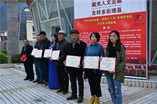 四川新闻网理县9月29日讯(朱梦琪 吴孟)在新中国成立70周年之际,为歌颂70年来的光辉成就,展示理县各族群众奋发的精神面貌,阿坝藏族羌族自治州理县“我和我的祖国——辉煌70年 幸福新理县”书法美术摄影展暨颁奖仪式在二办公区圆形展厅举行。