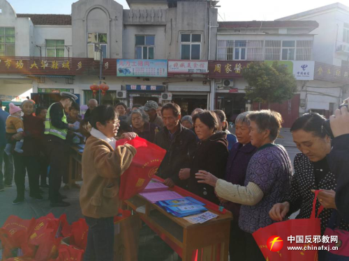工作人员发放反邪教宣传购物袋