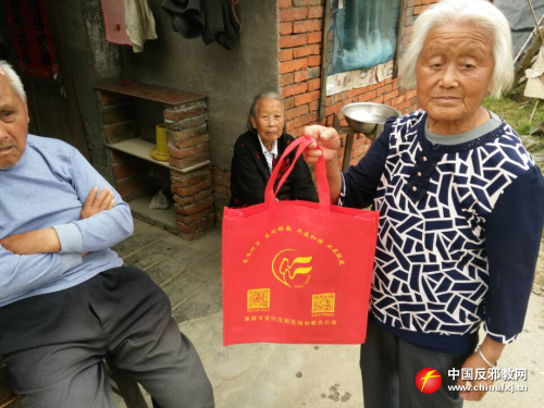 上门入户向老年人宣讲邪教知识并发放反邪教购物袋