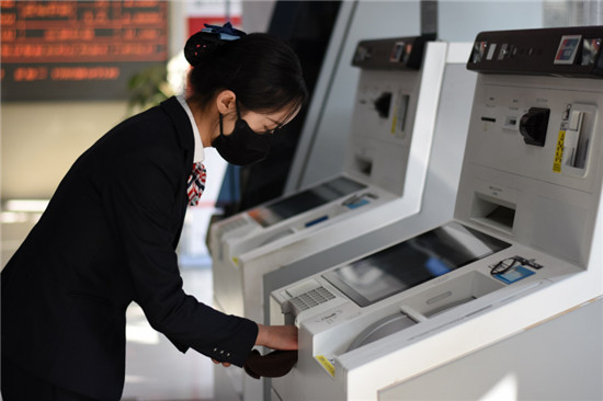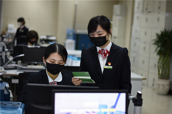 疫情期间,成都农商银行各网点正常营业,确保服务不打烊。图为柜面工作人员正戴着口罩为客户办理业务。