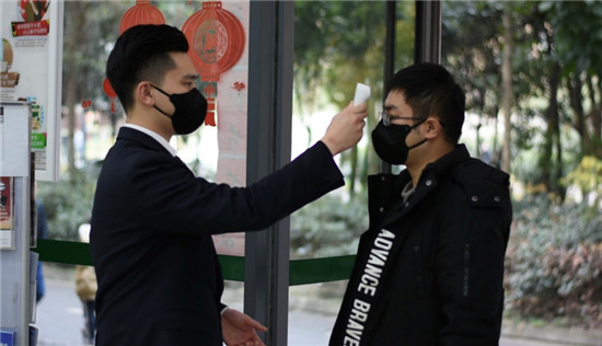 成都农商银行网点工作人员正在为前来办理业务的客户测量体温。