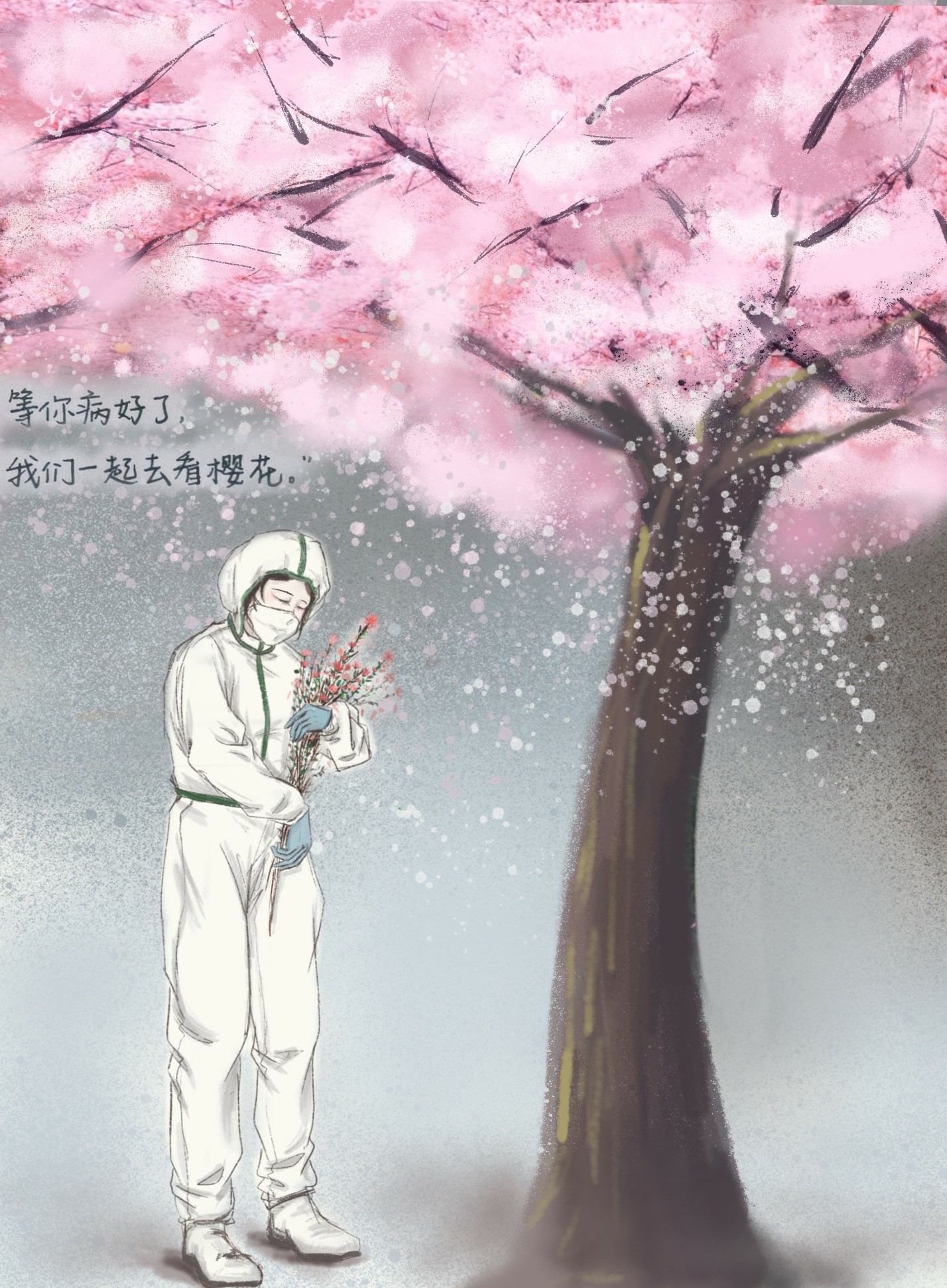 没有一个冬天不能逾越,没有一个春天不会到来。用樱花树代表武汉,白衣天使守护。武汉加油!中国加油!待到春暖花开,我们一起去武汉赏樱花。