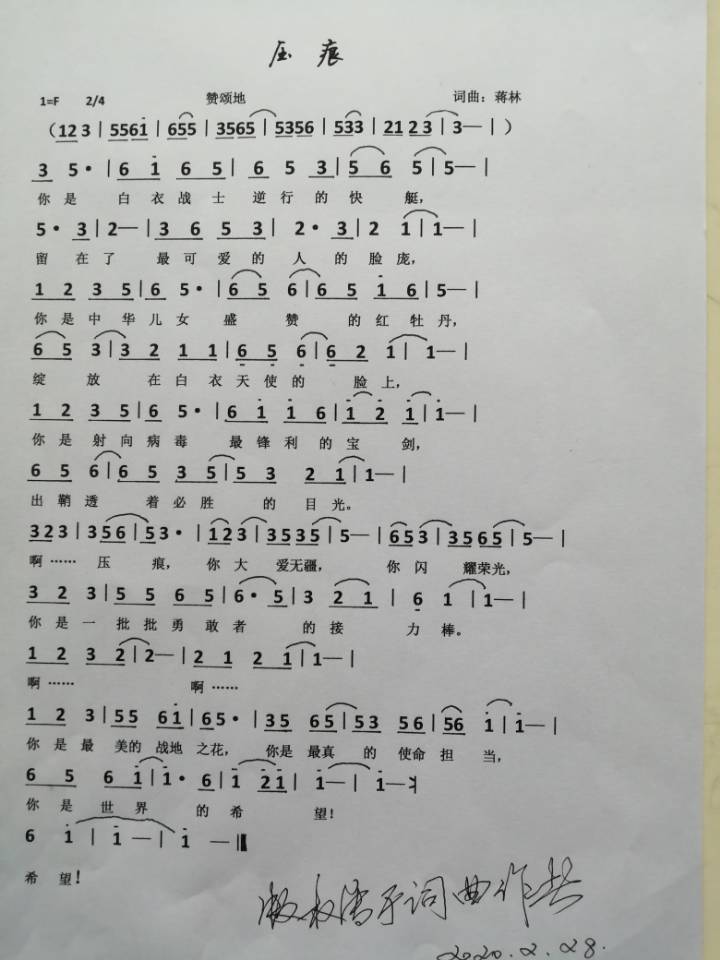 我是一名即将退休的小学教师,一名普通的基础教育工作者。在2020年抗击新冠肺炎的战斗中,白衣天使敢冒危险,逆行武汉,顽强地奋战在第一线,防护服压在白衣战士脸上那深深的压痕,也深深地感动了无数国人。于是,我在感动中以“脸上压痕”为题,创作了这首歌,用以感恩一线战士英勇奋战,确保百姓平安。我通过自己作词作曲、自己弹唱的方式传递正能量。