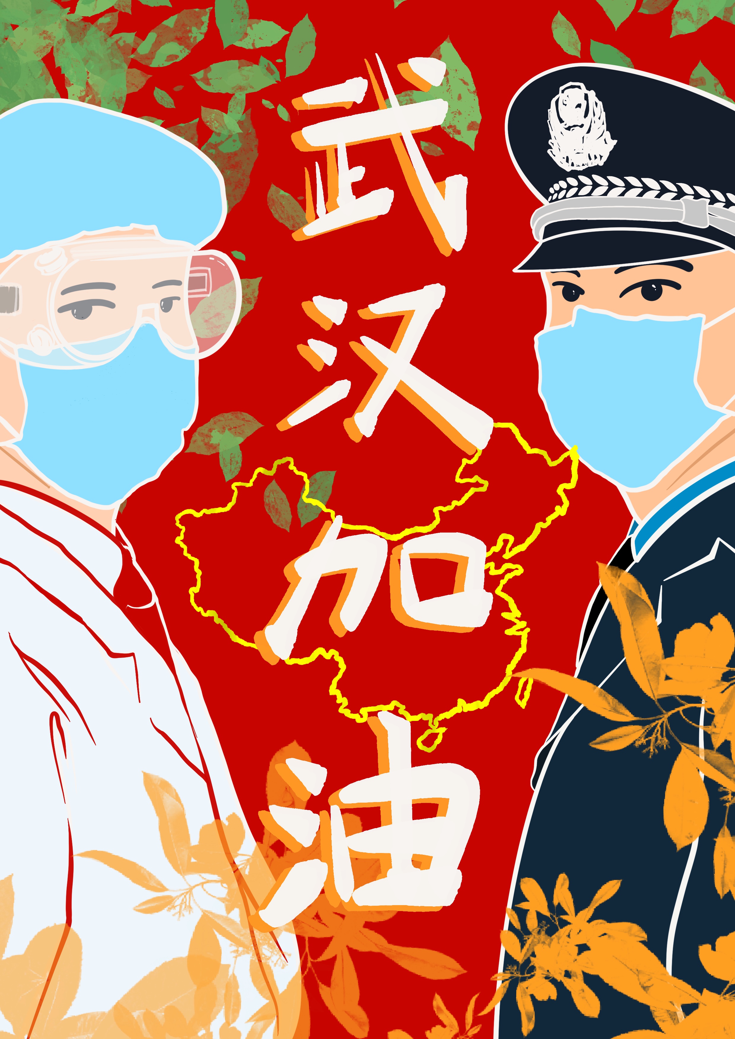 画面被裁剪了武汉的轮廓,用红色填充意为疫情的严重性;左右两边有医务人员与警察,他们是在疫情期间的“逆行者”,冲锋在最前线,守护我们的平安。
