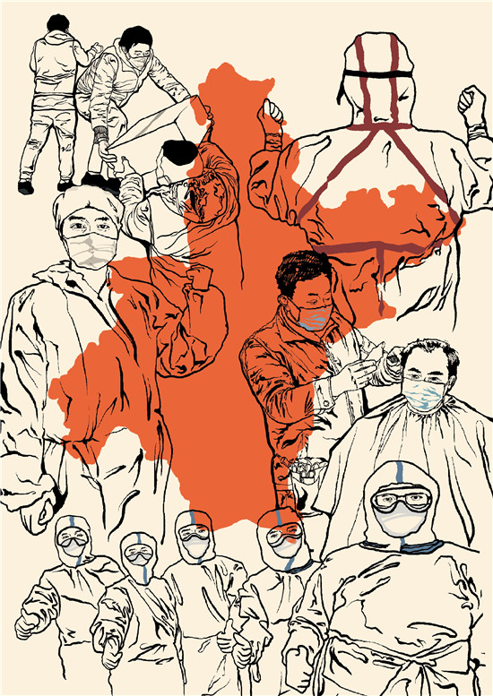 用速写拼贴了在疫情一线治愈患者、志愿服务默默奉献的面孔,在防护服和口罩的遮挡下虽不知他们的面孔,但是他们的勇敢行动展示给了我们他们的美丽。