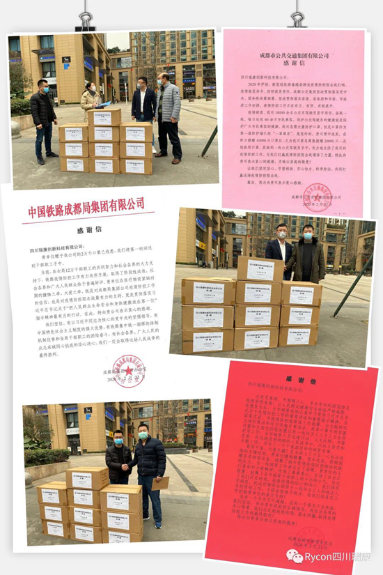 继2月21日完成首次捐赠后,2月22日,四川瑞康向成都市公共交通集团有限公司、中国铁路成都局集团有限公司、成都市城市管理委员会等单位捐赠第二批合计六万只医用口罩,为奋战在一线的公交司机、铁路职工和环卫工人加油鼓劲。同时,接受捐赠的单位也纷纷发来感谢信表示感谢。