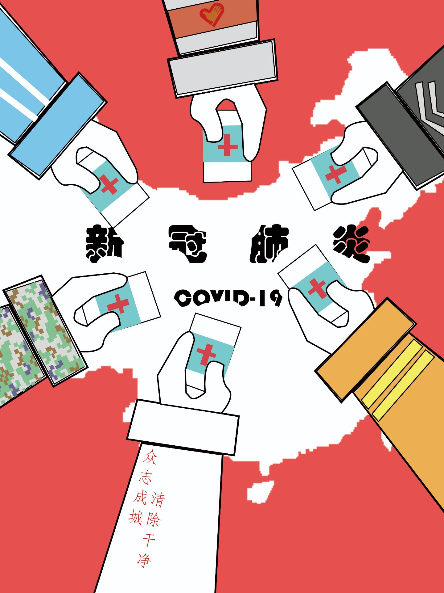 面对突如其来的疫情,全国上下齐心协力,众志成城,每个人都为抗击病毒做出自己的贡献,海报中的每只手分别代表着医务人员、解放军、人民警察、环卫工人、青年学生、志愿者等,表达了坚决与疫情抗争到底的决心。