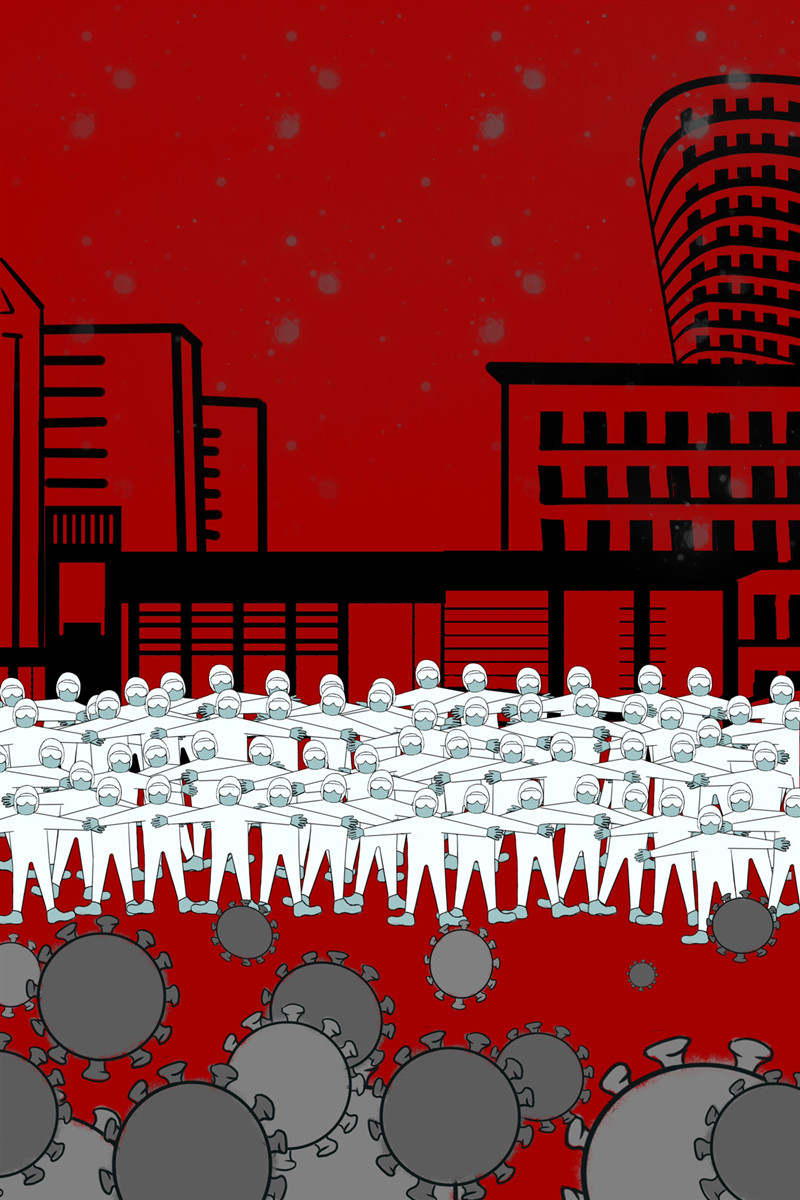 图片中最前面是大大小小的圆形物体代表着新型冠状病毒,最后面是各种城市建筑,而穿着防护服的医护人员则在新型冠状病毒和城市中间,一层层的医护人员手挽着手,肩并着肩为城市形成了一层抗击病毒的屏障,整张图片背景色为暗红色,寓意着疫情的紧急和无情,给人一种压抑的感受,而他们是疫情来袭时的最美逆行者,更加突出医护人员的无私和伟大。
