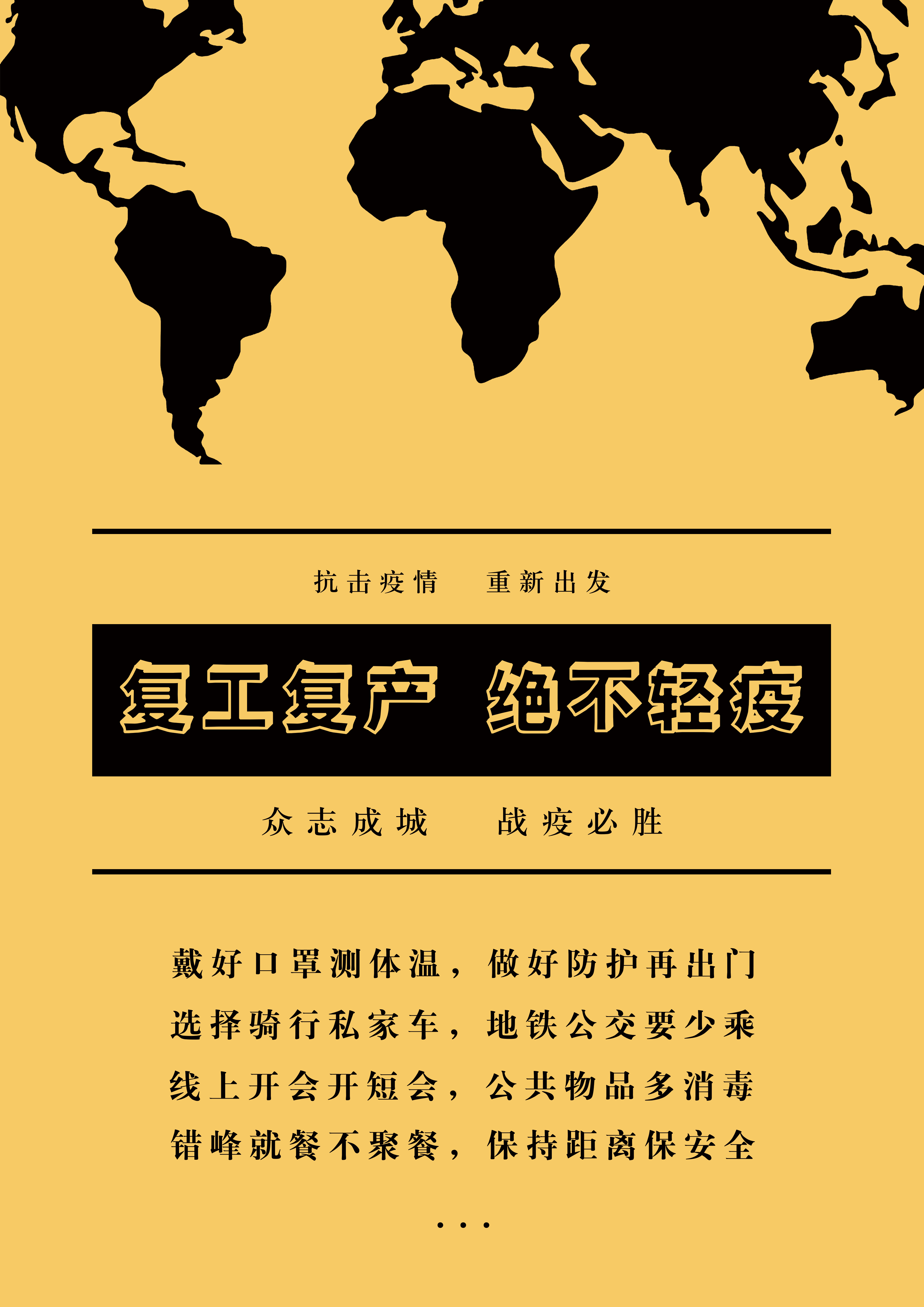 这是一张严肃的复工防疫提醒海报。国内疫情好转,复工复产不容易,现在仍然不能掉以轻心,轻视疫情。