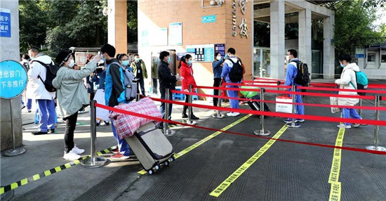 在成都汽车职业技术学校,在校园内各部分紧密配合下,高三学生分时错峰安全返校。