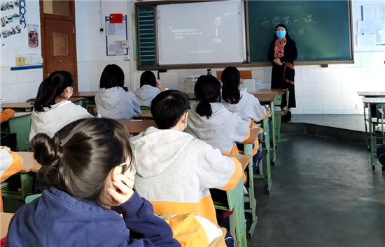 作为复课第一天,在洛带中学,全校各班在学校的组织下在教室里积极开展以预防新冠肺炎疫情为主题的开学第一课,通过观看视频、班主任讲解、学生交流互动等形式,让师生能够正确应对肺炎疫情防控,学习相关的防疫知识。