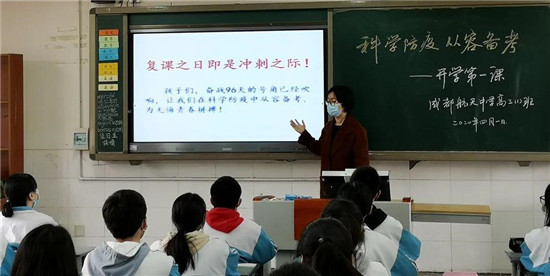 在航天中学,为了保证高三年级师生迅速进入高考临战状态,年级组在学生报到当天组织全年级上好开学第一课,把疫情防控教育和高考动员结合起来,做到疫情防控培训和思想教育两促进,同时学校高三年级领导小组全体成员全部进入班级听课,并将结果进行汇总分析,进一步优化课堂管理。