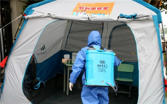 在龙泉二中学校大门口,不仅准备了异常学生隔离区,还专门设置了临时健康观察室。在教学期间,如发现异常学生,在离教学楼最近的地区还准备了4间健康观察室和备用教室。高三学生住校生较多,学校考虑到学生中万一出现了异常情况,通知家长后,因特殊原因家长又不能及时到校接走孩子,学校为住校生设置了专门的“健康观察室”。小小的“观察室”里准备了床铺、洗手液、消毒纸巾等生活用品,到这里等待家长的学生感到安全舒适。