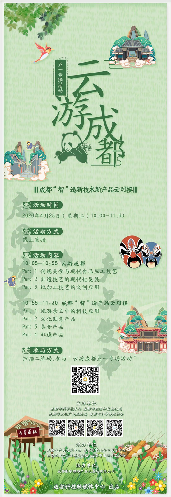 据悉,本次直播由成都市科学技术局、成都市经济和信息化局、成都市文化广电旅游局、成都市科学技术协会主办,成都生产力促进中心、成都市中小企业服务中心、成都工业文化发展促进会、成都市旅游商品协会承办。
