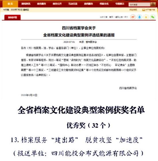 四川新闻网成都7月10日讯(朱梦琪)近日,四川省档案学会、四川省档案馆通报了全省档案文化建设典型案例评选结果,四川能投集团所属川能分布式公司的《档案服务“建出路” 脱贫攻坚“加速度”》案例获优秀奖。