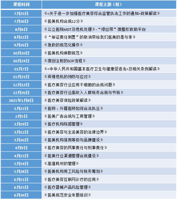 四川新闻网7月26日讯 2020成都夏季医美月期间,为深入贯彻落实八部委《关于进一步加强医疗美容综合监管执法工作的通知》文件精神,在成都市经济和信息化局、成都市卫生健康委员会、成都市市场监督管理局的指导下,在高新区管委会、武侯区政府、温江区政府的支持下,由成都市医美产业协会、成都市整形美容质量控制中心、高新区生物产业发展局、华西大健康产业功能区管委会、温江区医美产业协会、北京至瑾律师事务所将开展为期一年的《医美规范安全专题培训》。该培训通过视频直播的方式,共24期,每期60分钟,要求成都所有医美机构全程参加培训。各机构代表需将培训课程转工作群,培训记录和学习考核将纳入成都市整形美容质量控制中心年度考核评分,作为医美机构年审参考材料。