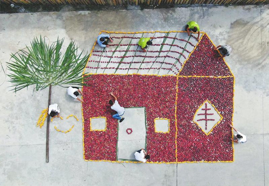 9月3日,在德阳市旌阳区柏隆镇隆兴桥村百香果种植基地的一农家院坝,村民们将采摘的1000余斤百香果、300多斤玉米,摆放成带有“丰”字的美丽新居,庆祝丰收、展示生活美。 本报记者 肖雨杨 摄