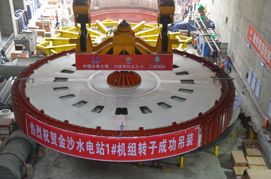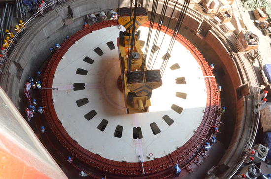 金沙水电站是金沙江中游十级水电枢纽规划的第九级,是长江上游经济带的重要组成部分,总装机容量560MW,多年平均发电量 21.77亿kw.h,总投资74.23亿元。发电机转子是机组最重要的设备,由中心体、扇形支架、磁轭、磁极等部件组成,本次吊装具有体积大、重量大、精度要求高的特点,转子直径16.32米,高1.96米,起吊总重量达735t,吊装难度较大。此次吊装采用一台450吨+450吨桥机双钩抬吊方式将转子及附件整体吊入机坑。