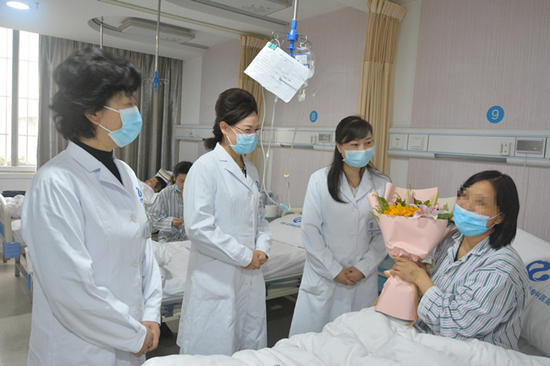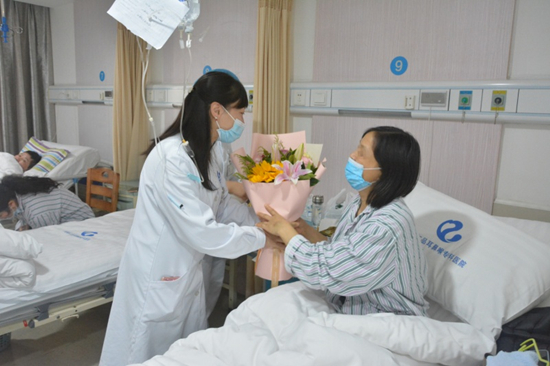杜女士收到鲜花非常惊喜,没想到会在医院得到这么多温暖和关怀,开心地说:“我刚来医院时情绪特别不好,对于治疗也很抵触,是谭明敏医生对我无微不至的关心感化了我,她不仅治疗了我的疾病,还治愈了我的心情,现在又专门给我送来鲜花,让我感受到了亲人一般的温暖。还有领导们百忙之中也专门来看望我,真的太感动了。谢谢你们!”