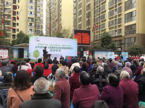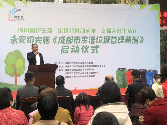 在启动仪式上,双流区永安镇党委副书记、镇长、永安镇垃圾分类试点示范小区工作领导小组组长任小利表示,《成都市生活垃圾管理条例》,将于今年3月1日正式实施,距今只有2天了。这标志着垃圾分类工作即将进入强制实施阶段,我们要深刻认识垃圾分类的重大意义,以“承担绿色责任,贯彻绿色理念,传播绿色文明”的行动自觉,做实做细做好垃圾分类工作。