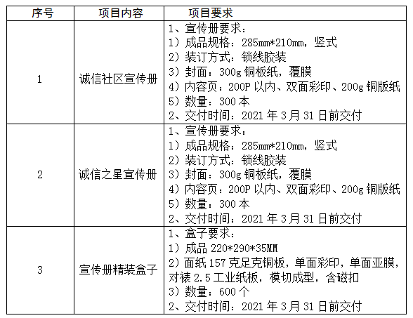 兹准备印刷诚信社区暨诚信之星宣传册,现向社会供应商进行询价,符合相应资质条件的供应商请根据询价通知书进行报价。项目的采购、质量、服务需求和供应商报价所要具备的条件如下: