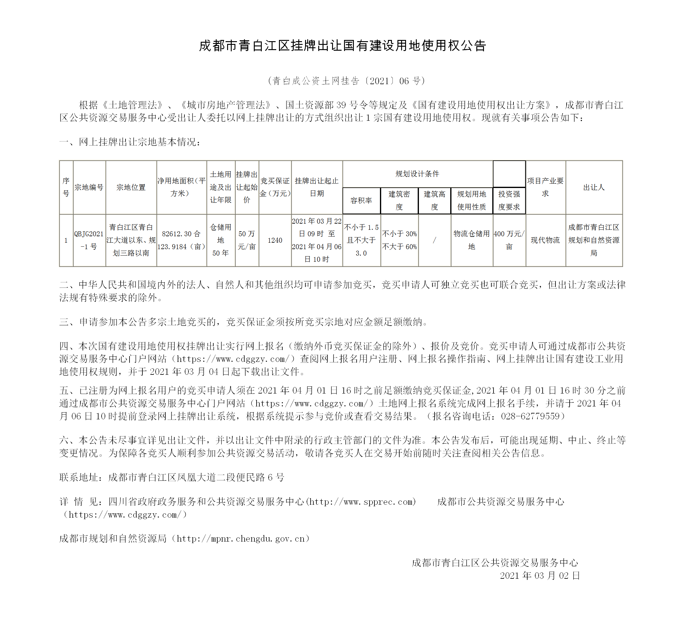 成都市青白江区挂牌出让国有建设用地使用权公告(青白成公资土网挂告〔2021〕06号)